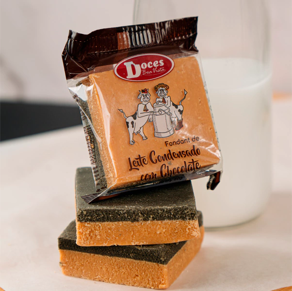 Nosso tradicional fondant de leite condensado, o famoso das vaquinhas, possui um sabor suave e envolvente de leite e agora ganha uma versão sofisticada com sabor de chocolate.